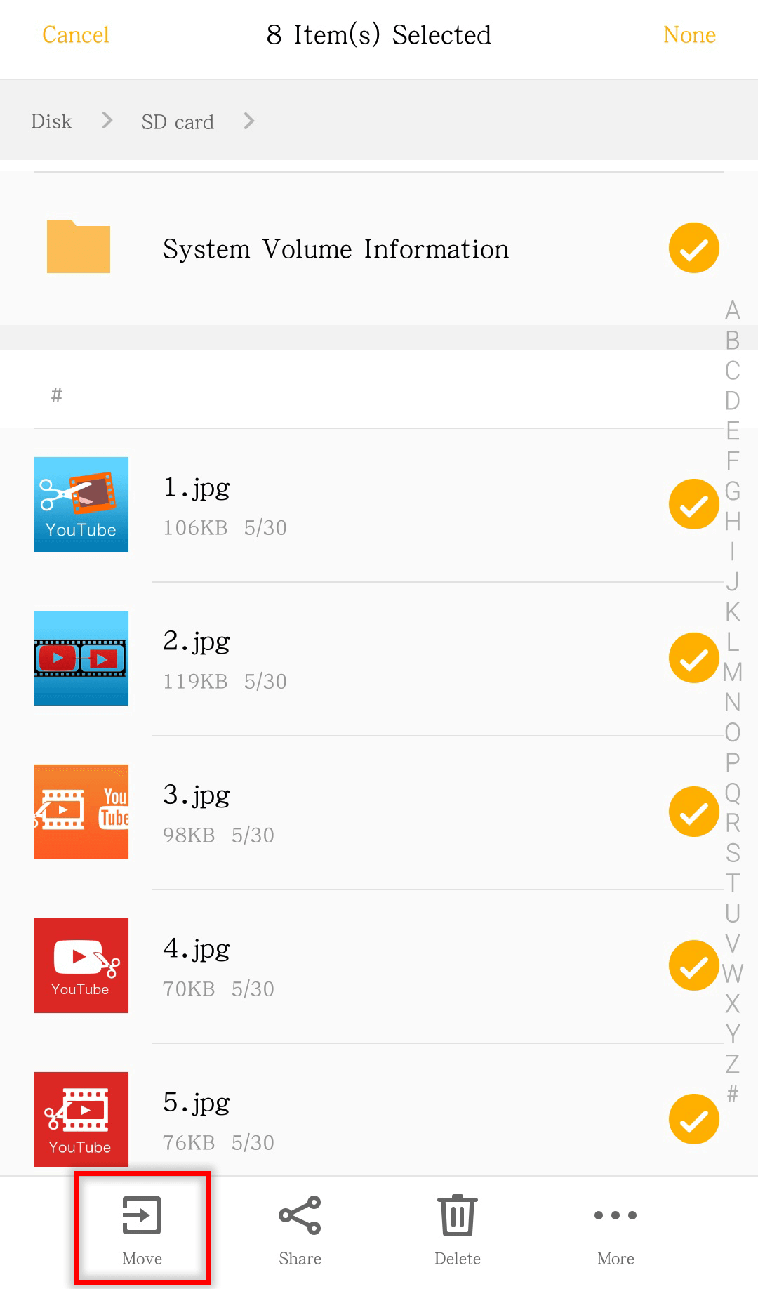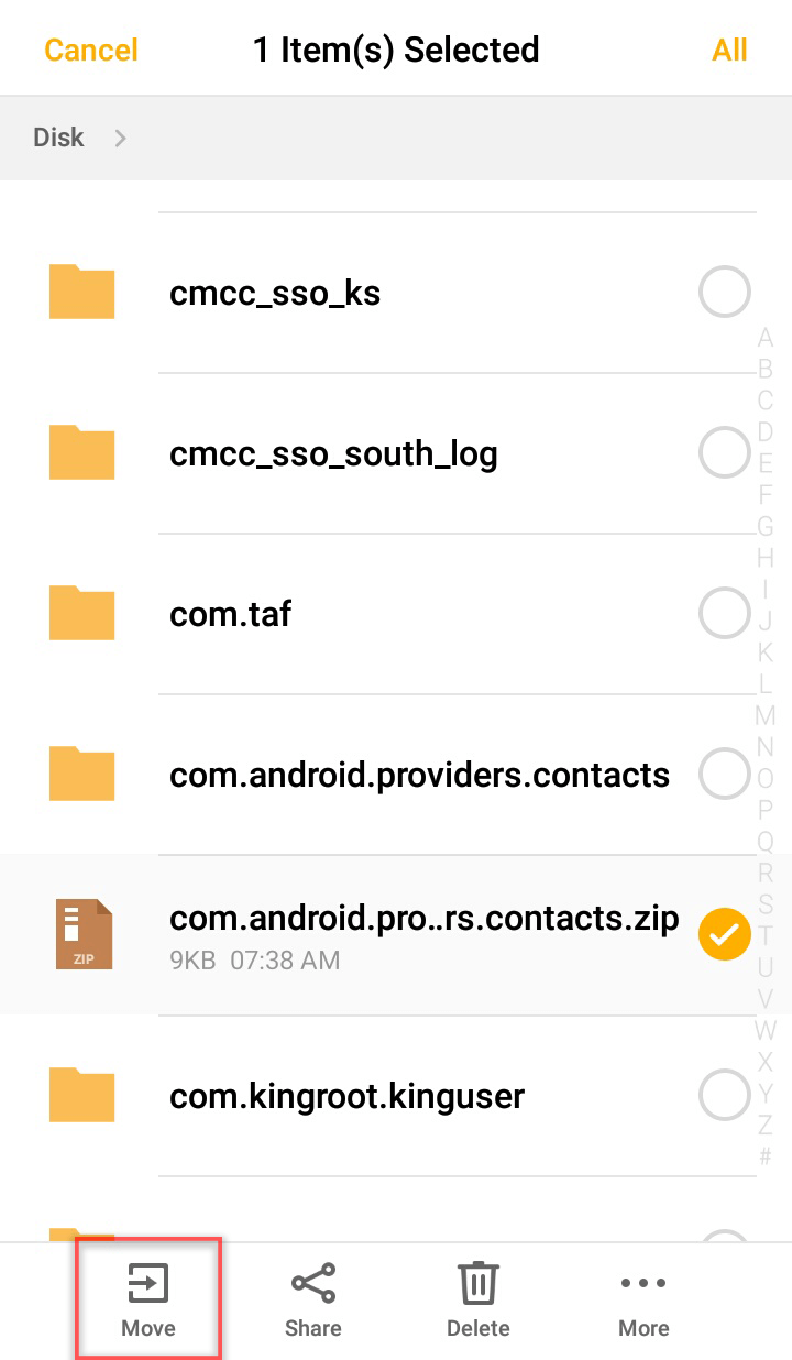 ⑤ Go to [Files] > [All files]. Then, select the target data and tap [Move].