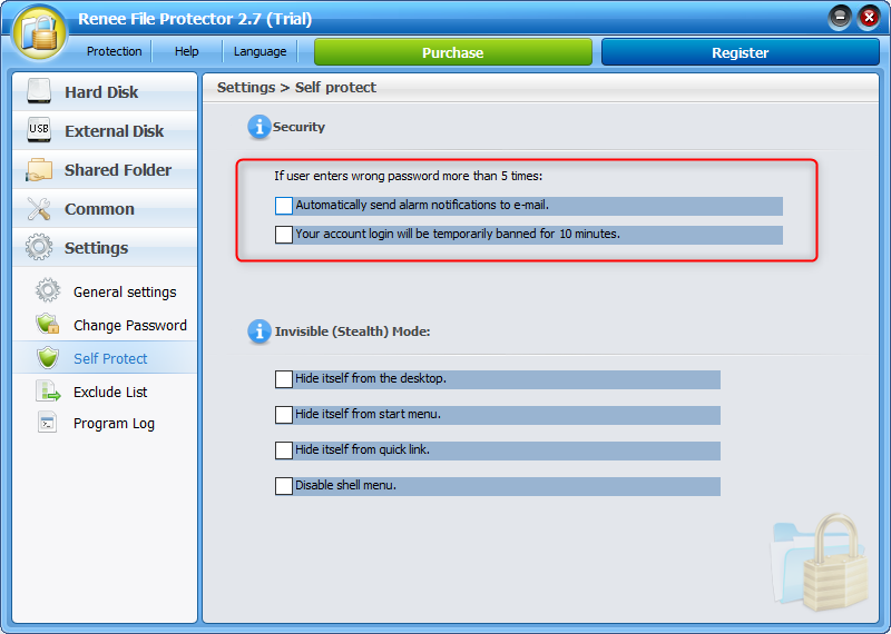 ● The software is powerful and supports multiple encryption and locking methods. And the software can carry out self-protection settings to prevent brute force cracking. As long as the password is entered incorrectly for 5 consecutive times, the software will automatically send an email to the mailbox to notify that the crack has occurred. And it can be set to prohibit the operation of entering password access within 10 minutes.