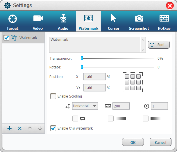 It allows users to add text and image watermark. Click the button [+] at the bottom-left to add the watermark. Then you can set transparency, rotate and adjust the position. You can also enable watermark scrolling.