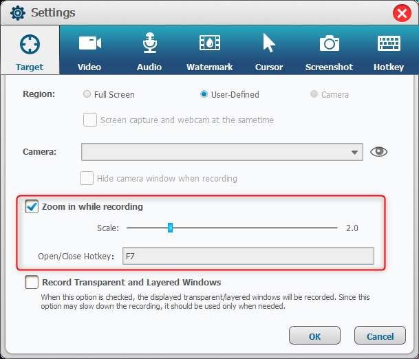 It allows users to scale up the recording screen in proportion, 1.5x to 4x bigger than the original size. Users can scale up the important images when recording. The hotkey is F7.