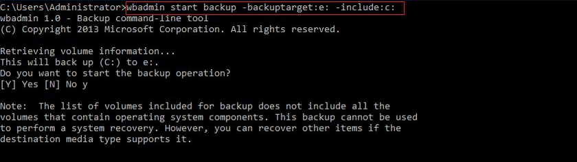 Wbadmin start backup -backuptarget:e: -include:c:Wbadmin start backup: Run a backup.