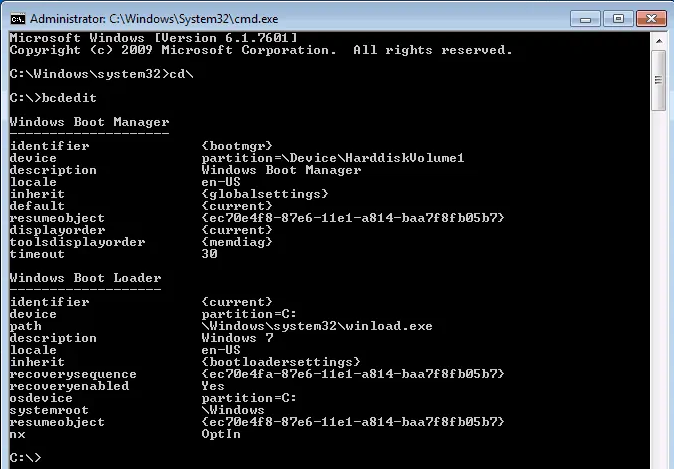 C:\>bcdedit /export "C:\bcdtemp.bin"