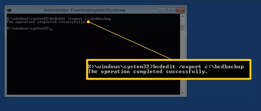 Step 4: When Total Windows installations identified: 1 appears, you must manually delete the BCD store before rebuilding can begin. At the command line, type bcdedit /export c:\bcdbackup and press the key Enter.