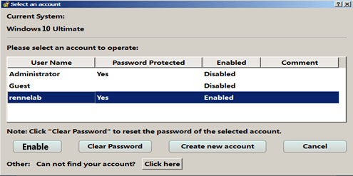 The created administrator account named “Reneelab” with administrator rights, and its default password is “123456789”. You are able to change the password of target account with this new created administrator.