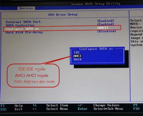Step 2: Take the following figure as an example, select (Devices>ATA Drives Setup>Configure SATA as), and then change (ACHI) to (IDE) compatibility mode. Press (F10) to save setting changes. Finally, restart the computer to see if the current problem is resolved.