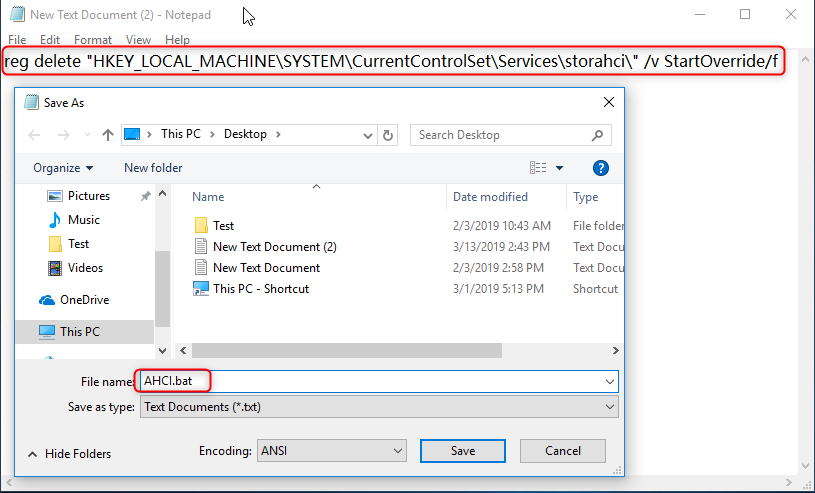 Step 4: Create a Text Document. Copy and paste the following command to the document and save as AHCI.bat.