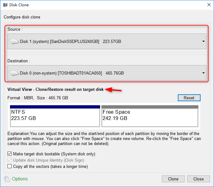 Step 2: Select your source HDD and target SSD. You will see the clone result on target disk via Virtual View. Then click “Clone”.
