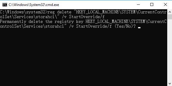 reg delete “HKEY_LOCAL_MACHINE\SYSTEM\CurrentControlSet\Services\storahci\” /v StartOverride /f