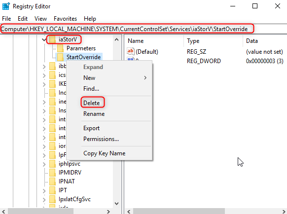 Step 3: Expand the “iaStorV”, then right click the “StartOverride” and click “Delete”.