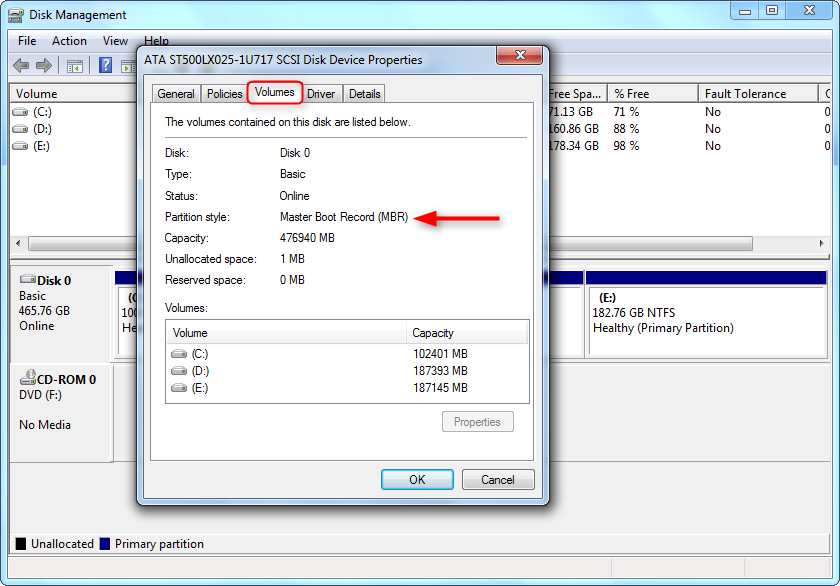 ④ Switch to the (Volume) tab, view (Partition style), here is MBR, need to use Legacy boot mode.
