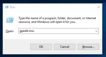 1.Press WIN key and R to open the run command. Then type gpedit.msc and click OK to open the Local Group Policy Editor application.