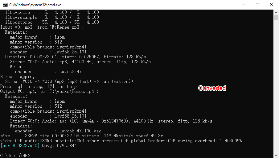 ③ Type [C:\Windows\System32\ffmpeg.exe –i F:Renee.mp3 F:\works\Renee.mp4] and press the Enter key to convert it to MP4.