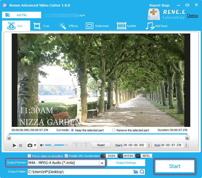 Step 3: Then, select the start and end time to cut the video. After that, search [M4A] in [Output Format] and finally click on [Start] to convert MP4 to M4A.