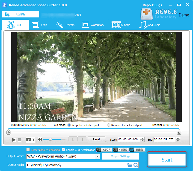 Step 3: Then, edit the video and drag the progress bar to cut the video. After that, select [WAV] in [Output Format] and finally click on [Start] to convert MP4 to WAV.
