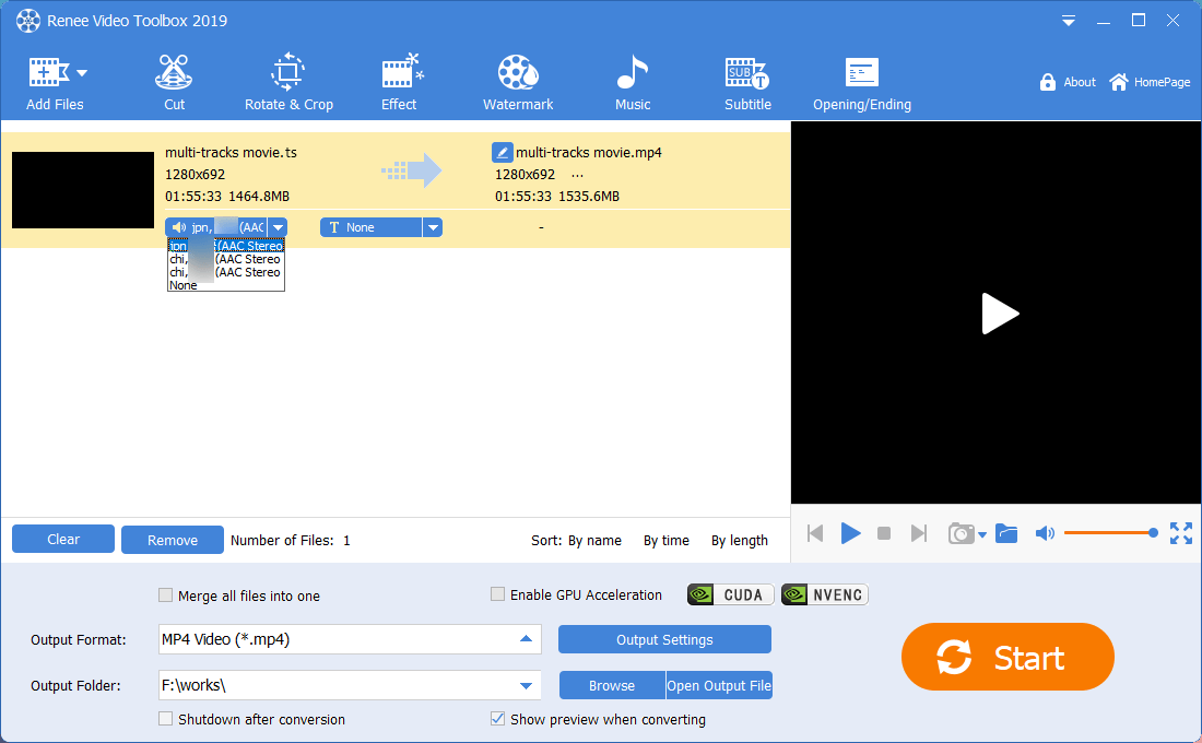 If you want to get a video with different dub or subtitle, Renee Video Editor Pro is recommended to convert TS video to MP4 which can help you select desired subtitle or audio tracks at the same time.