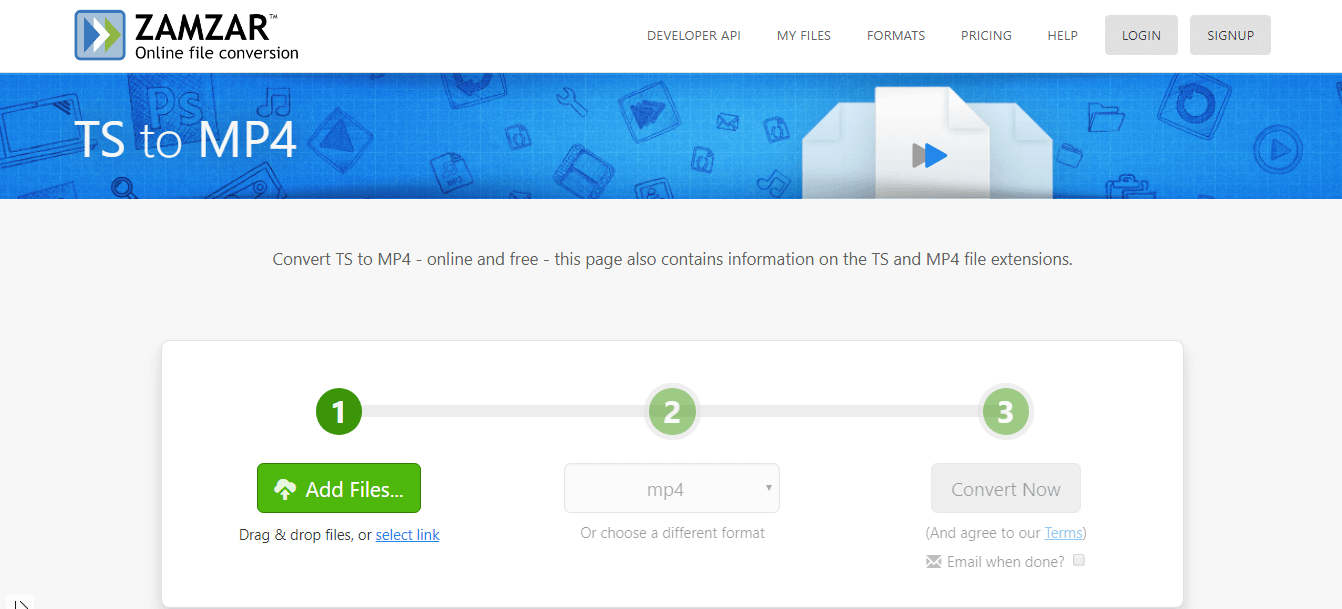 ZAMZAR Online File Conversion is the powerful online format converter. Next, we will show you how to convert TS to MP4 online.
