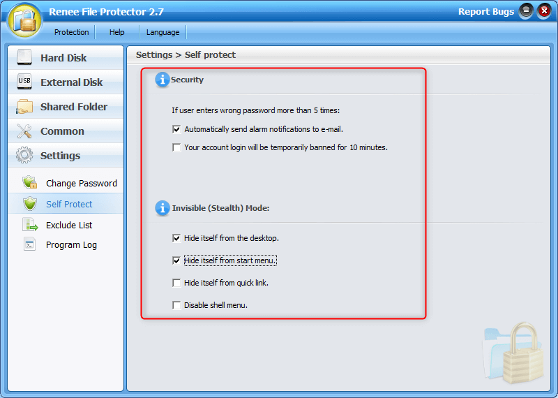 Overall protection Users can hide, lock or get other protection to files in local disk or USB disk.