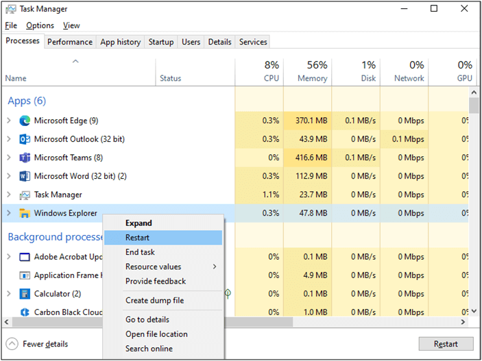 Step 2: Select the (Processes) tab. Right-click (Windows Explorer) and select (Restart). This process may take a few seconds, and the taskbar and (Start) menu may not be visible when Windows Explorer restarts. You can shut down the Task Manager after the process is complete and see if the problem is resolved.