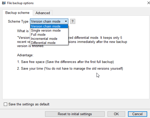- Version chain mode: Only save the 5 latest versions, delete the useless old version automatically when the backup is done.