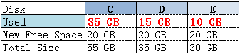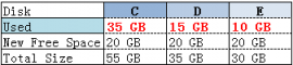 After clone…You are here:HomeItemAfter clone… Target disk: 120 GBFree space in total: 60 GB Conditions of 3 partitions after cloned: *After allocating the equal space to the used space of each partition, the rest 60 GB will be divided in to 3 parts equally and add to each partition separately.