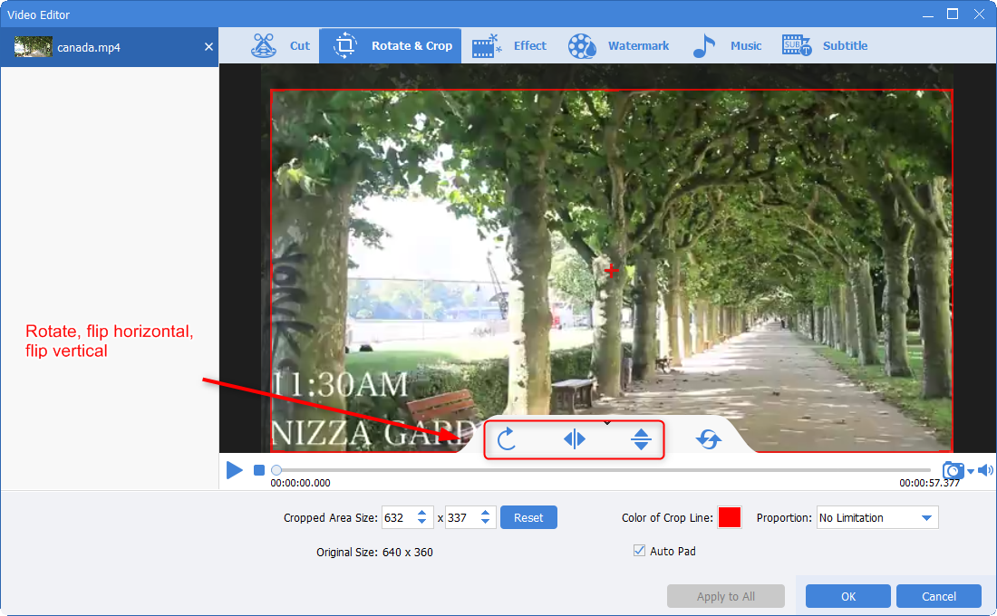 ⑥ Rotate the video. Also, in the function [Rotate&Crop], rotate or flip over the video screen.