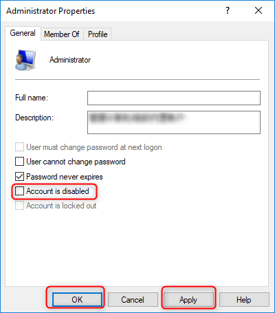 Step 3: Double click on “Administrator” and please do not check the option “Account is disable”. Finally, click “Apply” and “OK”.