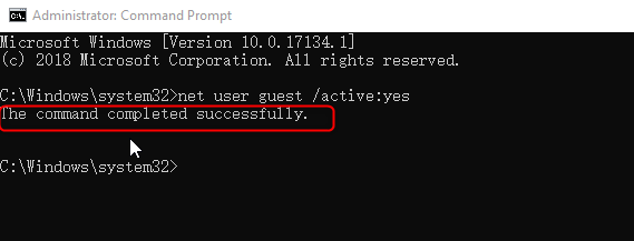 A message “The command completed successfully” will appear if guest account is enabled successfully.