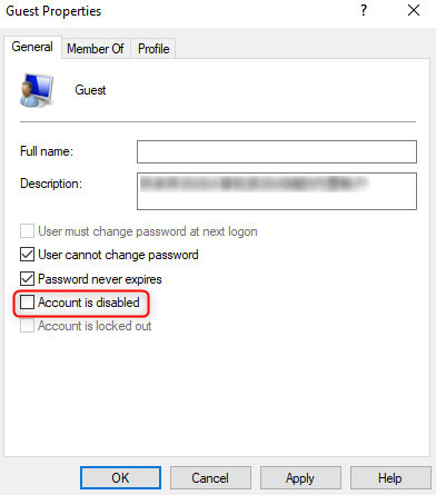 Step 3: When you see the “Guest Properties” window, please do not check the item “Account is disabled” and then click “OK”.