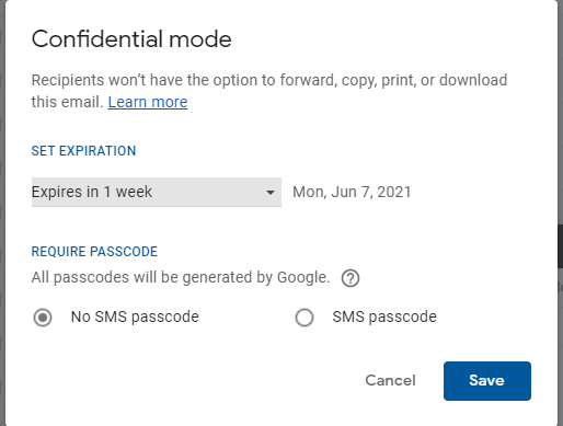 In addition, Gmail supports users to turn on the confidential mode when they are sending email. The followings are the steps.