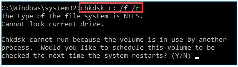 Step 2: In the command prompt window that opens, enter the command chkdsk C: /f /r and press the key Enter. If Chkdsk prompts that it cannot run because the disk partition is in use, please enter Y if you want to run the check plan next time the system restarts.