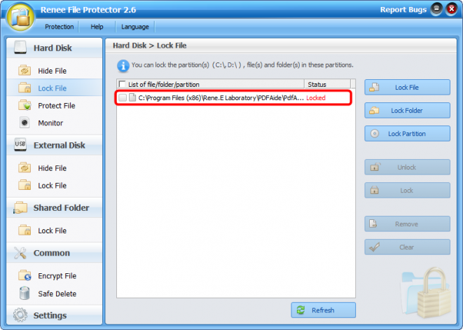 Step 3: After selecting the target “exe” file(s), Renee File Protector will auto lock the selected file(s). You can check the status on the list.