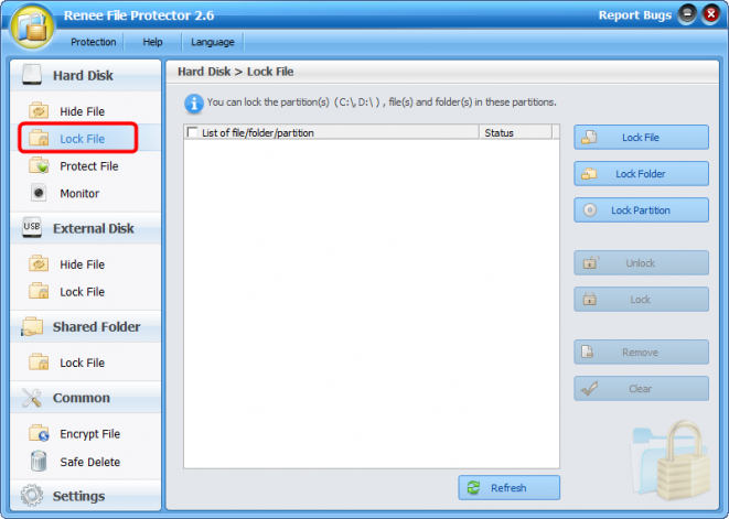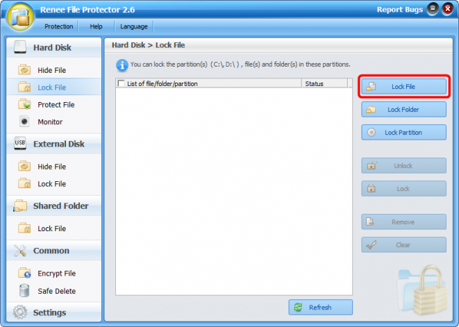 Step 1: Launch Renee File Protector and click “Lock File” in “Hard Disk”.