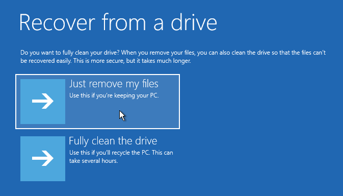 Step 2: After successfully booting from the USB, in the keyboard layout interface, select your frequently used language.Step 3: Click Select “Recover from a drive”, and then select “Just remove my files” or “Fully clean the drive” according to your needs.