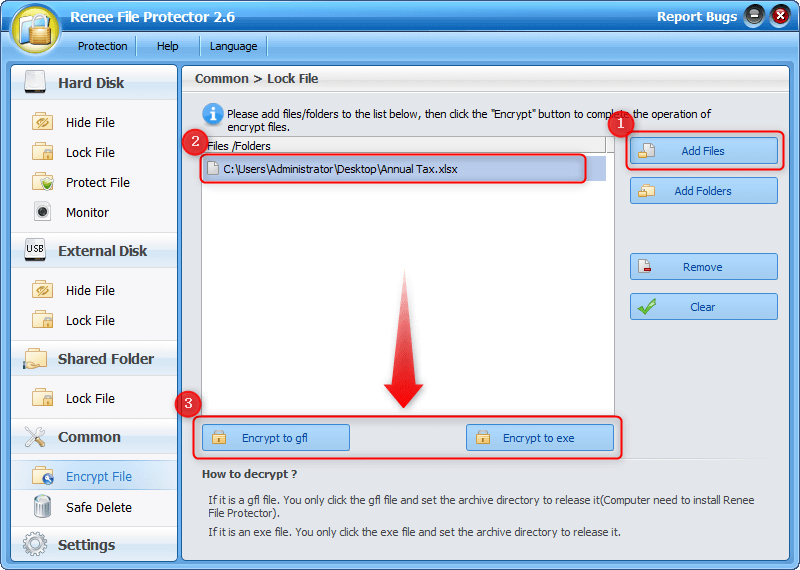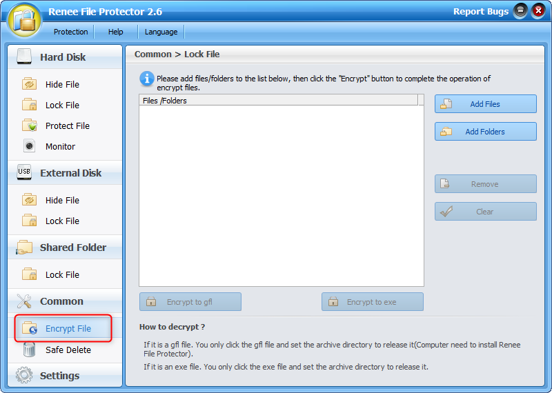 Step 1: Launch Renee File Protector. Go to “Encrypt File” in “Common”.