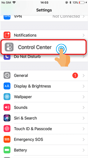 Step 1: Click “Settings” on the main interface of iOS device. Then please click “Control Center” to add the “Screen Recording” function.