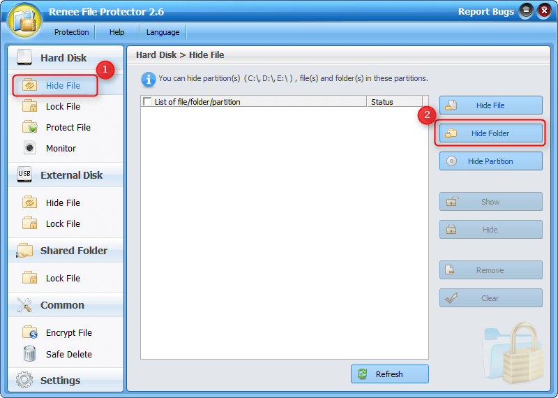 Step 1: Launch Renee File Protector. Click “Hide File” in “Hard Disk”. Then please click “Hide Folder” on the right side.