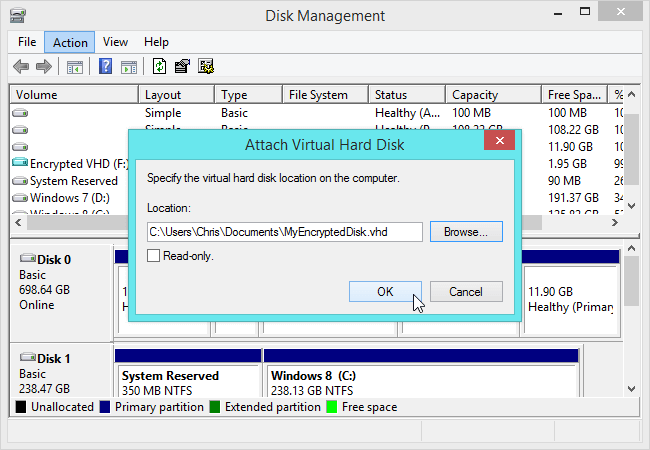 Please note that the size of this VHD files must be 64 MB or larger. Or the Bitlocker won’t work.