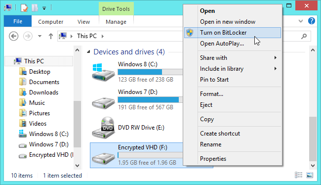 Step 7: Then the VHD will be shown in File Explorer. After putting the target folders inside, please right click the disk and turn on Bitlocker for it. Then please follow the Bitlocker setup wizard to lock the drive.
