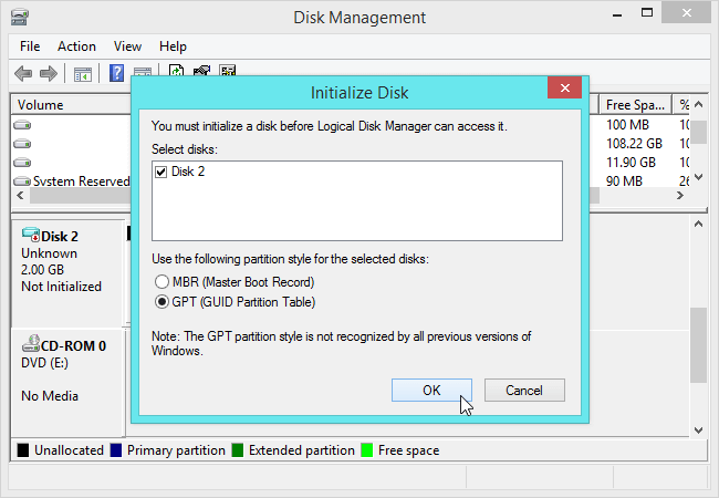 If you are using Windows 10/8.1/8, please choose GPT option. If you are using Windows or would like to be able to mount and access the VHD file in Windows 7, please chose MBR instead.