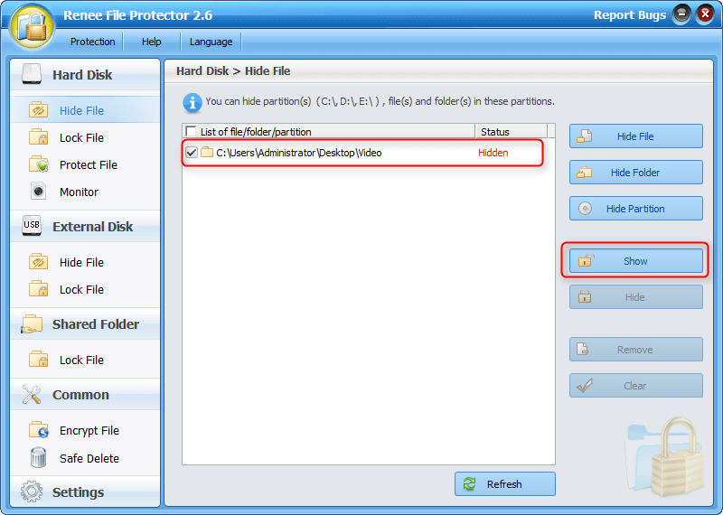 Step 3: If you want to access the hidden folder, please turn on Renee File Protector and check the target one in “Hide File” in Hard Disk. Click “Show”.