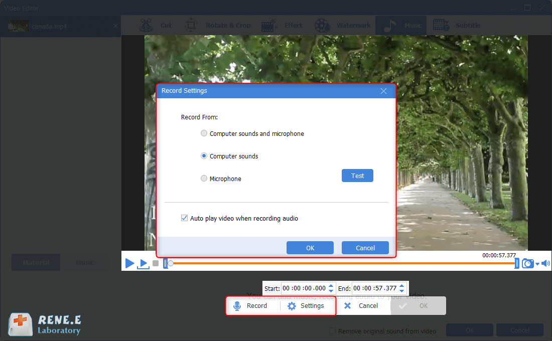 Step 4: Next, select [Record Voice-over for Video]. Then, click on [Settings] to select the sound source. After that, click on [Record] to record voice and set the start/end time for the voices. Click on [OK] to return to the last window.