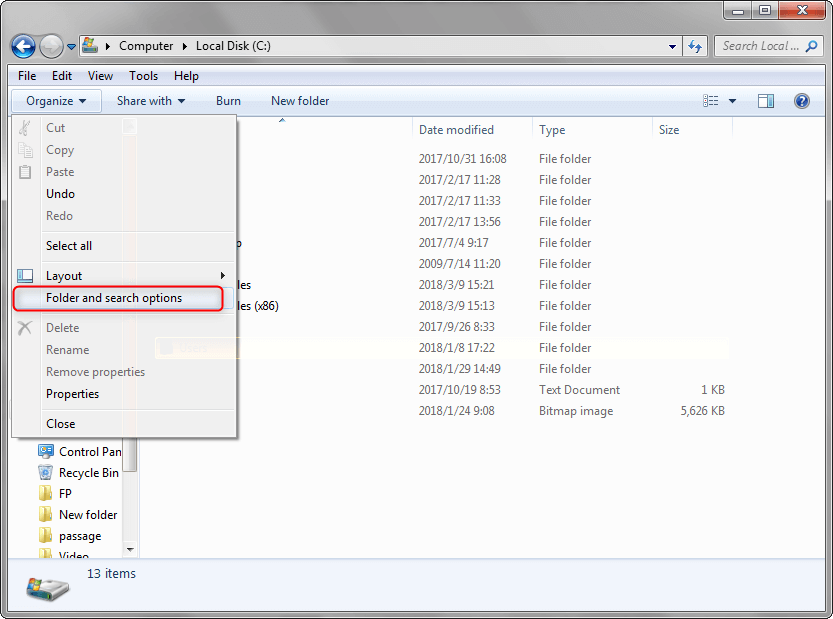 Step 1: Open any folder in Windows 7. Here we open Disk C as an example. Click “Organize” and then please go to “Folder and search option”.