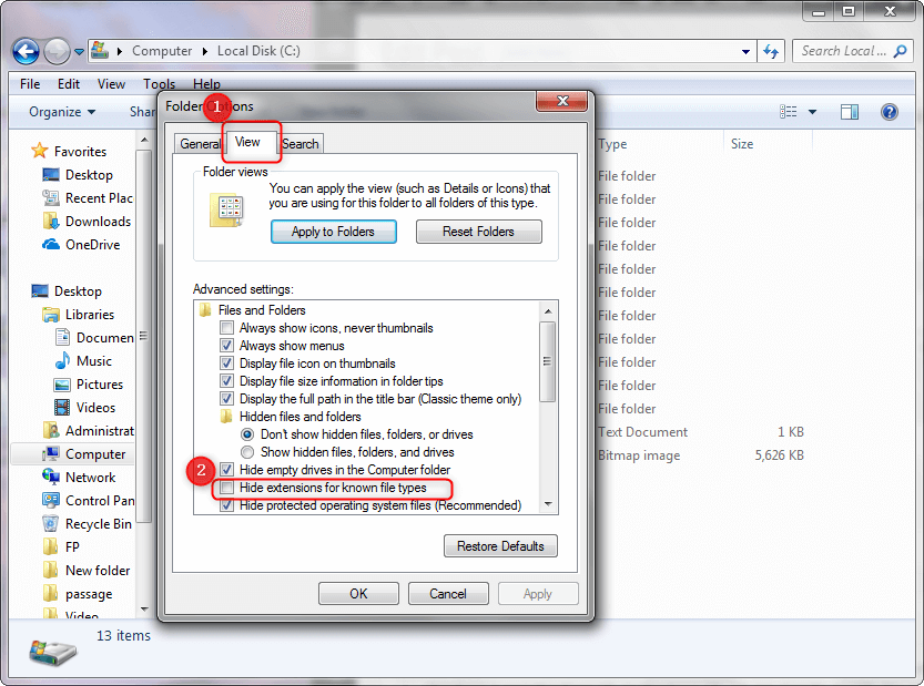 Step 2: Click “View” tab and then please uncheck “Hide extensions for konwn file types” item. And click “OK” to save the setting.