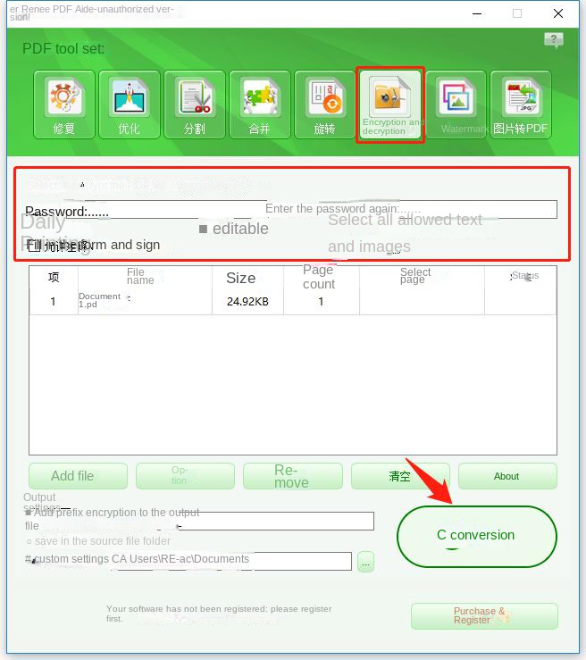 ③ Click the (encryption & decryption) tool in the upper menu bar. Then select (encrypt PDF file), enter the encryption password and perform other permission settings. After setting, click (Convert).