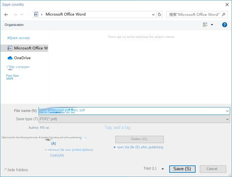 ① Open the PDF file to be encrypted in Microsoft Word, and click (File) > (Save As). Then in the Save As window, select (PDF (*.pdf)) from the Save as type drop-down menu, and name the PDF file.