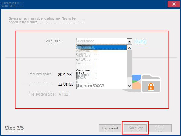 ⑤ After the setting is complete, select the size range of the disk, and then click (Next) to complete the creation of the private disk.
