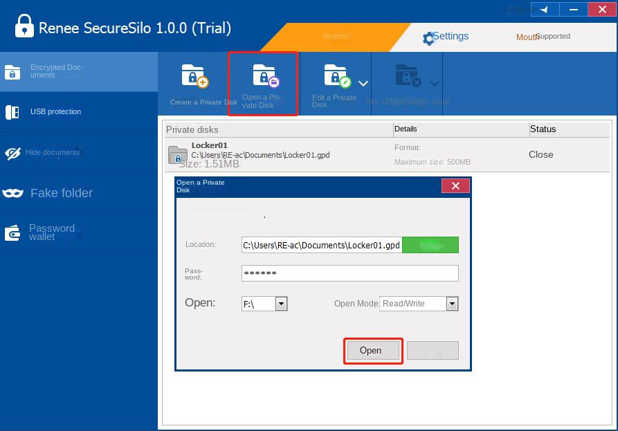 ⑥ In “Encrypted Documents”, click (Open Private Disk), enter the password, and click (Open). After opening the private disk, you can put the PDF file to be encrypted into the disk to realize the encryption protection of the file.