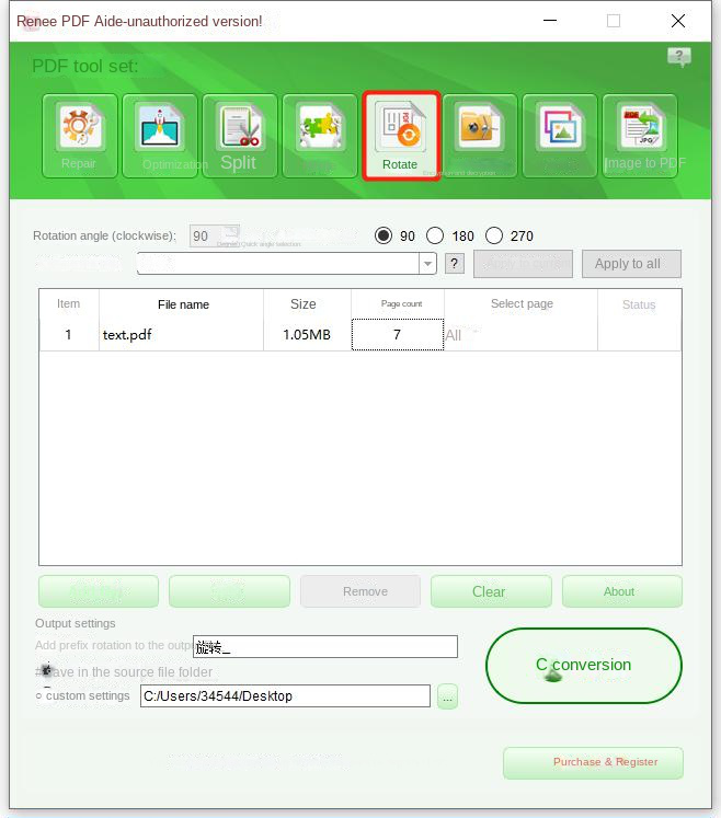 ② Click (rotate) to select the angle to convert, such as 90, 180 or 270 degrees. Also, you need to choose which pages to rotate, all pages or some pages.