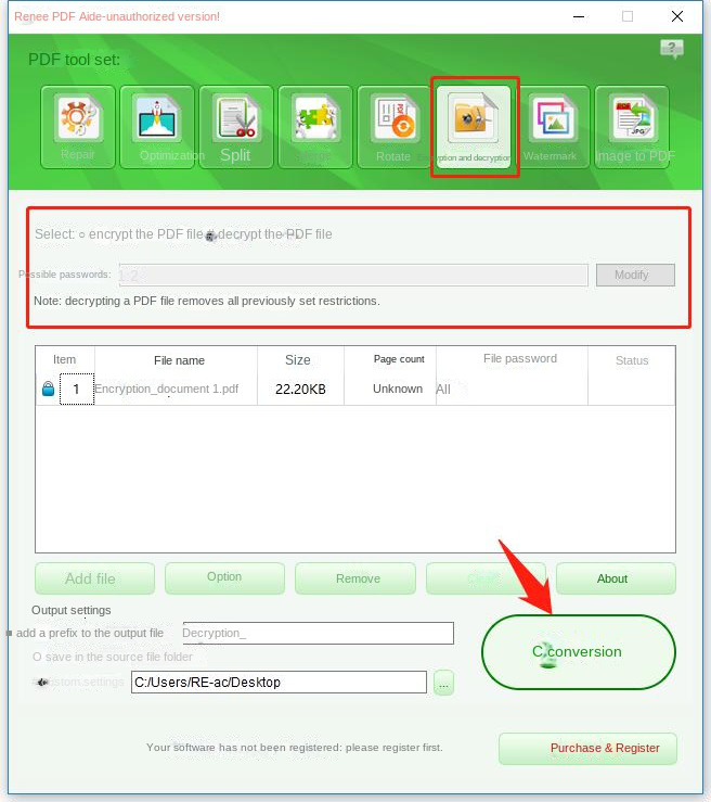② Click the (Encryption & Decryption) tool in the upper menu bar, and then select (Decrypt PDF file). You can optionally click (Modify) to enter possible password characters. Finally, after selecting the file output location and other output settings, click (Convert).
