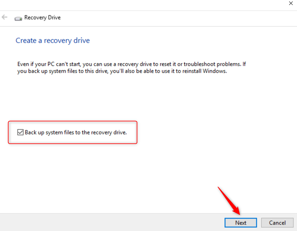 ② In the pop-up window, check Back up system files to the recovery drive and click Next. Select your USB drive from the list and click Next.